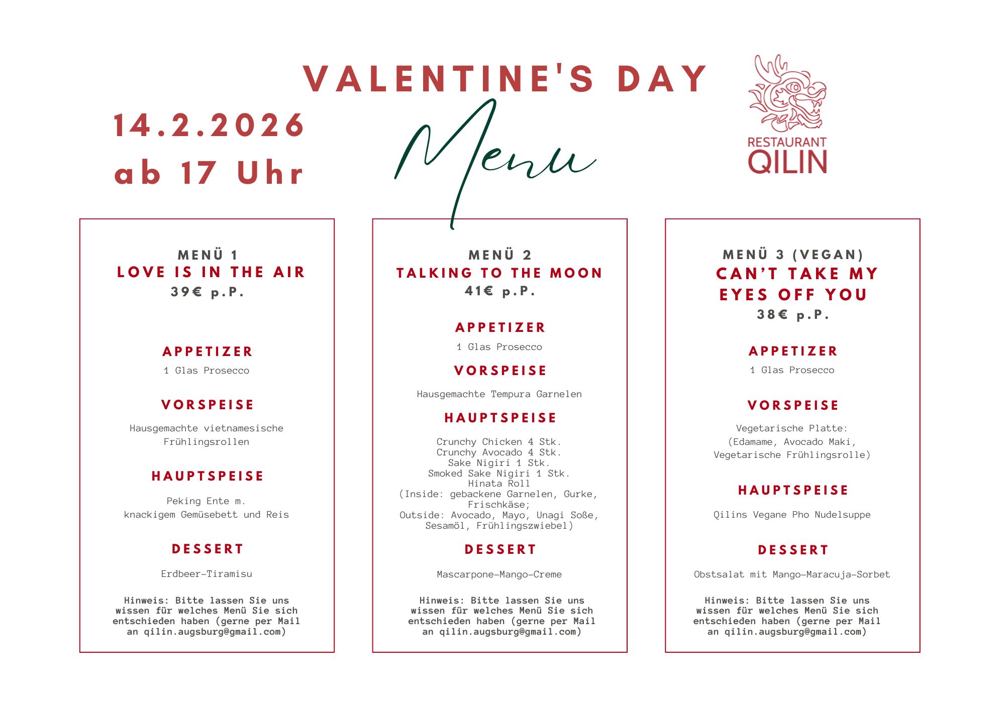 Hinweis: unser Restaurant bietet Sushi nur Fr/Sa/So ab 17:00 an.